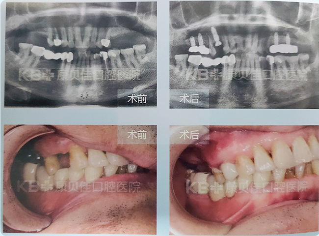 上颌双侧后牙陆续缺失,长达20余年,吃饭根本使不上劲。患者到院即要求艾斯纳博土帮他种植恢复咀嚼功能。左上通过种植2颗即刻恢复4颗牙,右上拔除松动的4号牙,植入3颗种植体,达到恢复咀嚼的效果。 现今患者已经戴_上好牙,上下后磨牙都可以咀嚼吃饭,非常开心。