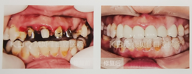 上前门牙龋坏后在外院做过烤瓷牙,最近几年烤瓷冠陆续松动、脱落。到院要求做全瓷冠修复恢复美观,效果满意。