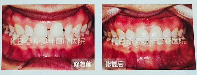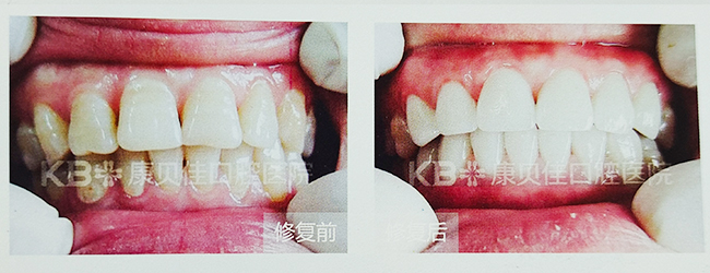 牙缝过大,牙列稀疏,全口氟斑牙不愿矫正,自己觉得影响美观,吃东西容易塞牙,说话漏风。到院处理后做了全瓷冠修复,效果满意。