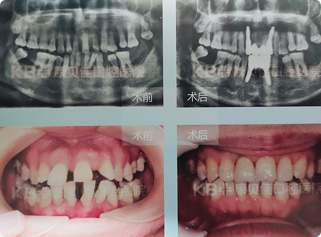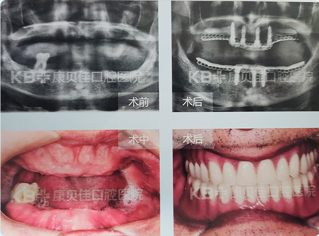 5年前牙齿开始松动、脱落,直到上半口掉光,下半口仅剩的几颗牙也摇摇欲坠,没有办法保留。为提高生活质量到康贝佳拔除松动牙,采用种植4颗技术恢复了上半口牙,下半口采用“缺多种少”方案恢复。