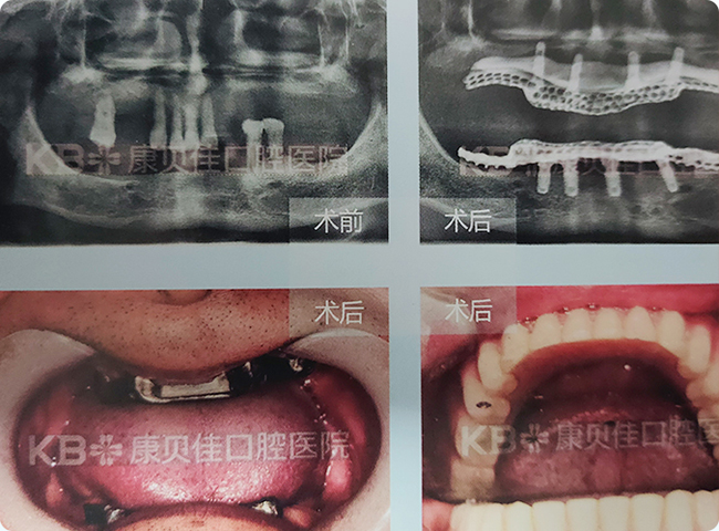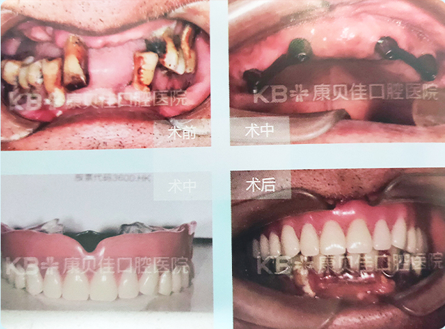 口内大部分牙齿缺失,影响进食,由于看到老伴用的活动假牙,每天取上取下,而且吃东西费劲,有时候还会磨出溃疡很痛苦,所以强烈要求固定式修复。康贝佳口腔种植科专家在其上颌植入4颗种植体并用杆卡辅助义齿修复,术后恢复效果好,咀嚼效率大大提高。