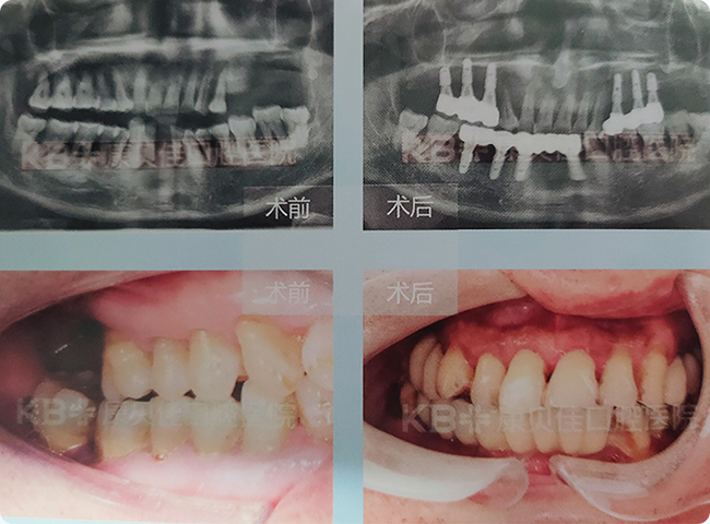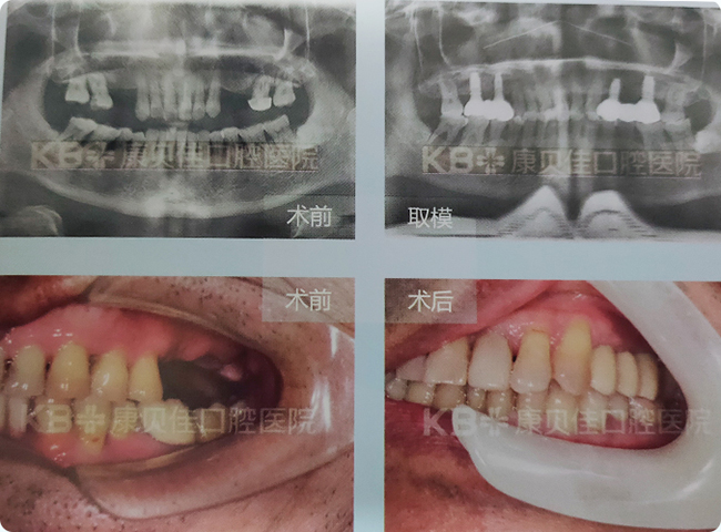 因为年轻时没有做好口腔保健工作,40多岁时牙齿开始脱落。由于缺牙时间比较长,存在牙槽骨骨量不足的问题。康贝佳口腔种植专家决定帮他进行上颌窦内提升的同时植入种植体,缩短治疗周期。戴牙后什么都能吃,特别开心。