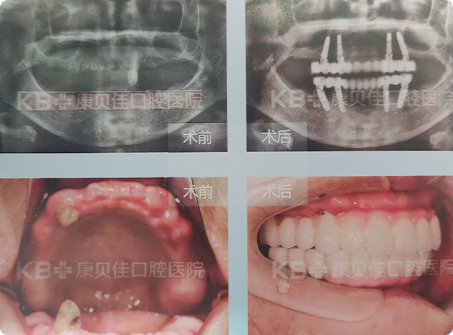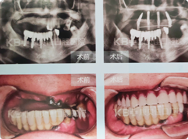 由于缺牙时间长牙槽骨萎缩厉害,活动假牙也越来越戴不住了。在朋友的介绍下到康贝佳,采用种植4颗植体技术恢复了上半口牙,下半口采用“缺多种少”方案恢复。