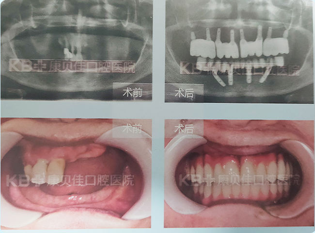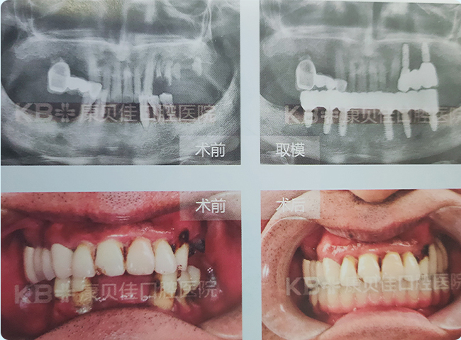 因牙周炎致牙齿松动,拔除,全口种植,期间活动义齿过渡修复,半年后完成永久性修复。